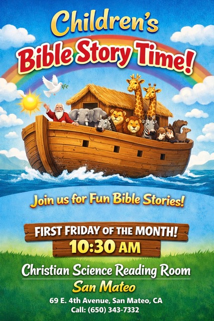 Join us for fun Bible stories! Children’s Bible Story Time takes place on the first Friday of every month at 10:30 AM. This community event is held at the Christian Science Reading Room in San Mateo. Location: 69 E. 4th Avenue, San Mateo, CA. For more information, call (650) 343-7332.