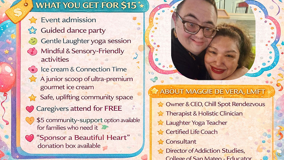 From Chill Spot: This uplifting 60–90 minute social includes: A guided dance party, a gentle laughter yoga session, mindful, sensory-friendly activities, and a junior scoop of ultra-premium ice cream.