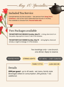 Mother’s Day weekend private garden patio bookings at OLHSO House. Two packages: Brunch (11 AM-2 PM) and Dinner (5-9 PM). Includes complimentary tea service. Email hello@olhsohouse.com to reserve.